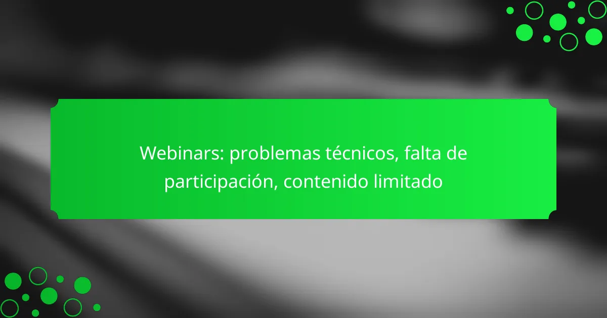Los webinars pueden enfrentar diversos desafíos que afectan su efectividad, como problemas técnicos que interrumpen la experiencia del usuario y limitan la participación. Además, es fundamental mejorar el contenido para mantener el interés de la audiencia, asegurando que los objetivos sean claros y que se utilicen elementos visuales atractivos. Abordar estos aspectos es clave para maximizar el impacto y la interacción en futuras sesiones.